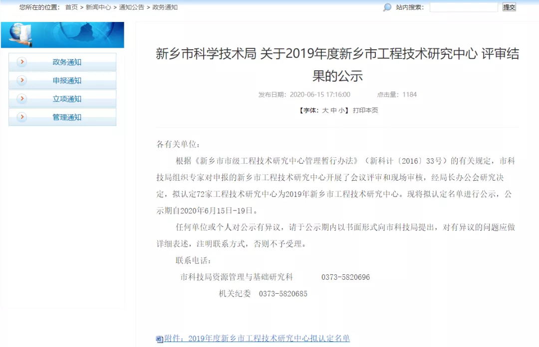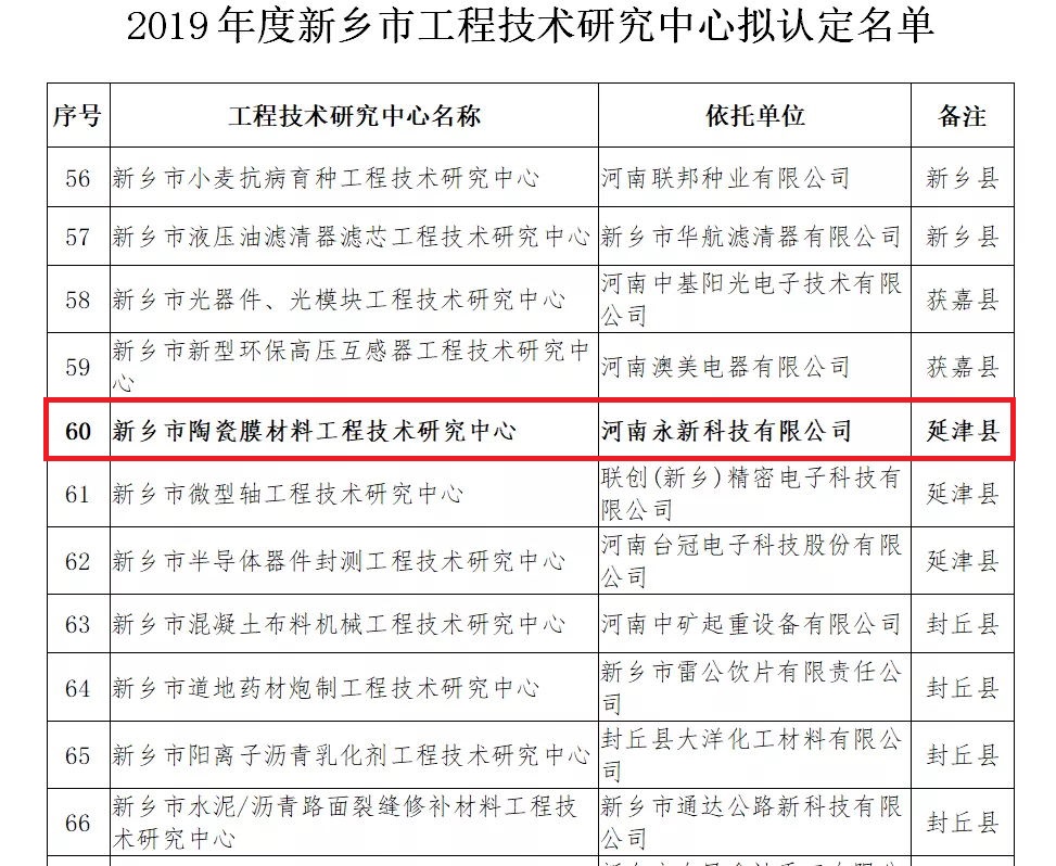 河南永新科技有限公司申报的“新乡市陶瓷膜材料工程技术研究中心”顺利通过评审,这不仅是新乡市科学技术局对我公司一直以来坚持科技成果转化、知识产权自主保护等方面所做出努力的肯定,也充分证明了始终坚持以技术创新为内生产力是符合公司战略要求的。
